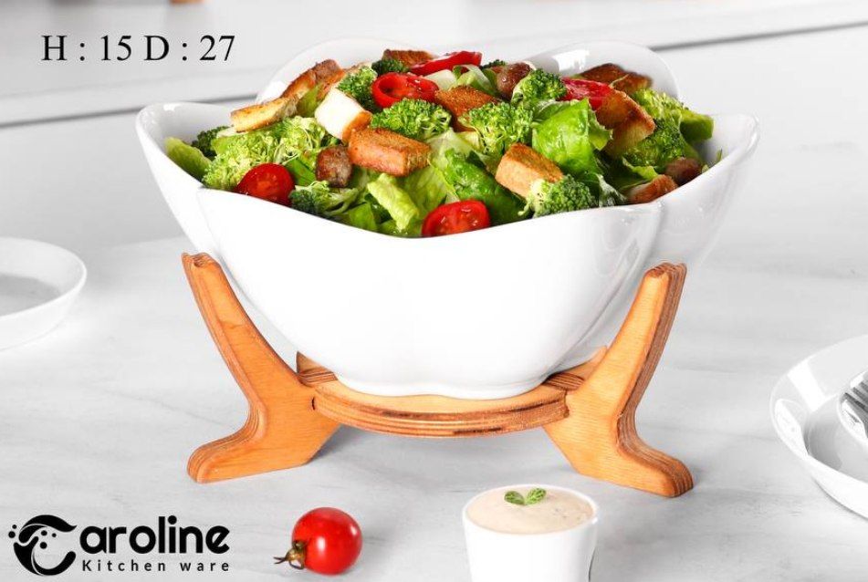 سالادخوری منحنی کارولین از جدیدترین سری سالادخوری های سرامیکی پر فروش کارولین میباشد که جنس بدنه از سرامیک بسیار با کیفیت و پایه ها از جنس چوب بسیار با دوام میباشد.