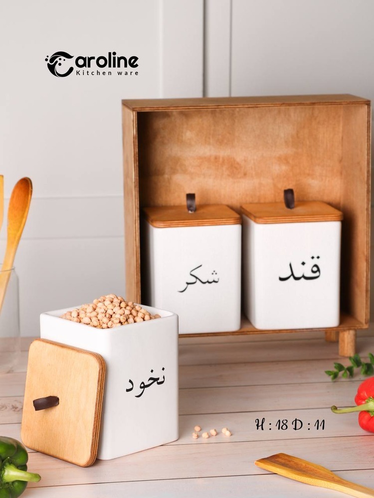 بانکه حبوبات سوپر کارولین با تکست های مختلف و جنس بدنه سرامیکی و درب چوبی و دستگیره از جنس چرم مرغوب برای سهولت در استفاده طراحی شده است.