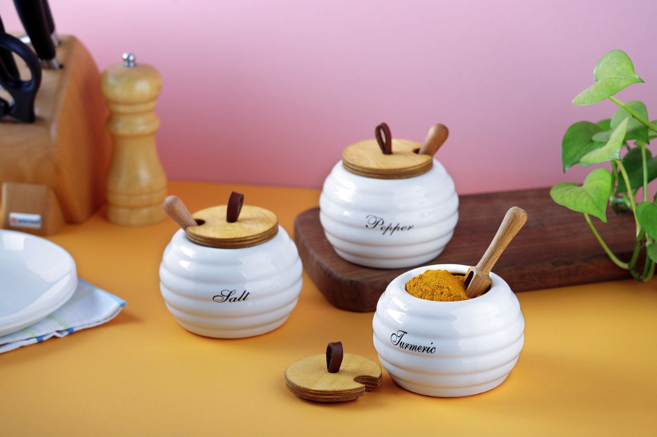 جا ادویه سرامیکی دلیار mvh محصولی درجه یک و نقلی جهت استفاده در آشپزخانه با درب چوبی با کیفیت میباشد.