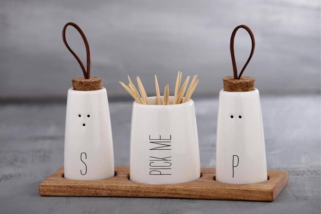 محصول ست نمکپاش سرامیکی هانا با زیره چوبی بسیار با کیفیت و جاشمعی بسیار زیبا در کنار نمکپاش ها که دارای تکست برای تشخیص نمک و فلفل میباشد محصولی بسیار زیبا جهت هدیه دادن و دکوری و استفاده روی میز است.