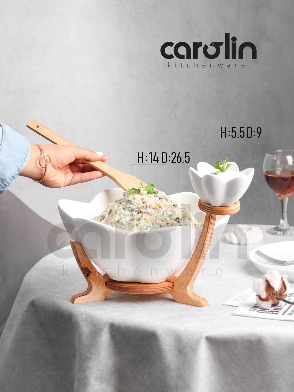 سالادخوری هلما کارولین که از جنس بدنه سرامیکی و پایه های چوبی بسیار با کیفیت و با دوام بوده که با طراحی خاص و جدید مورد توجه خریداران عمده قرار گرفته و با ترکیب چوب و سرامیک محصول ترند بازار نیز میباشد.