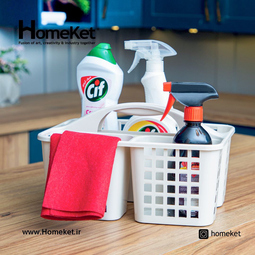 سبد نظمدهنده سارینا هوم کت، مقاوم و سبک با طراحی مشبک و دستهدار، مناسب مرتبسازی وسایل در آشپزخانه، کمد یا میز کار است.