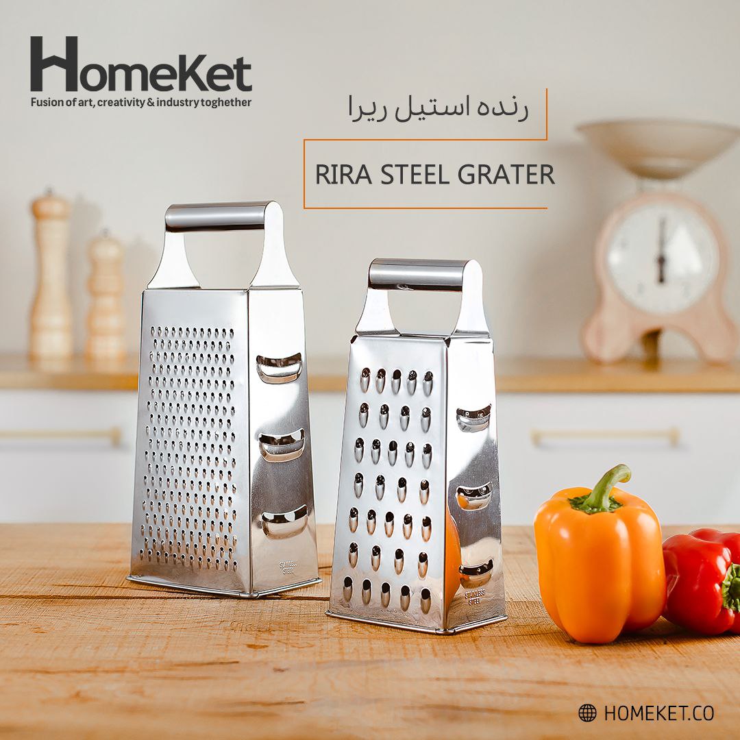 رنده استیل بزرگ ریرا هوم کت با تیغههای تیز و بدنه ضدزنگ، برای رندهکردن سریع و آسان انواع مواد غذایی طراحی شده و پایهدار است.