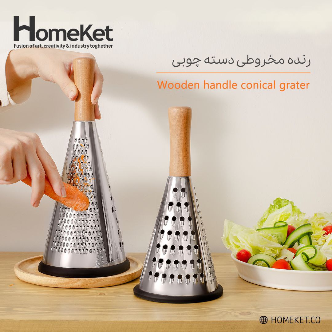 رنده مخروطی بزرگ هوم کت با طراحی سهطرفه و بدنه استیل مقاوم، برای رندهکردن انواع مواد غذایی با بافتهای مختلف مناسب است.