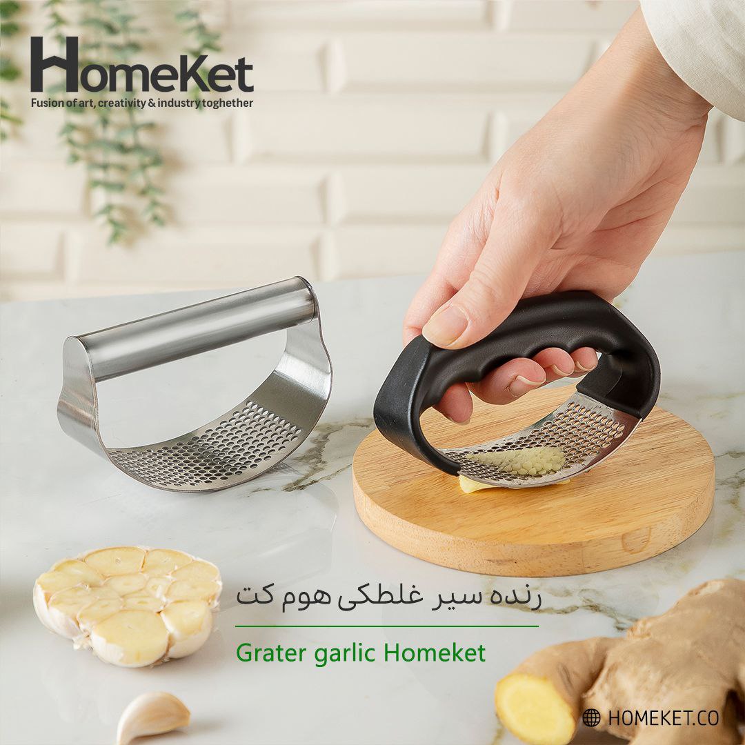سیر لهکن دسته استیل هوم کت، مقاوم و ضدزنگ با طراحی ارگونومیک، مناسب لهکردن آسان و بهداشتی سیر در آشپزخانه است.