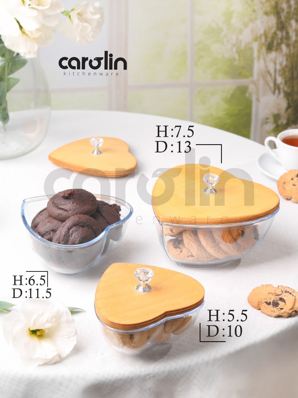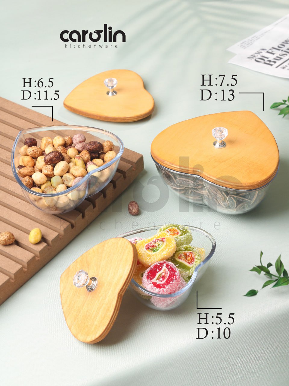کاسه قلبی سایز متوسط کارولین از آکرولیک مقاوم با درب چوبی الماسی، مناسب سرو شیک و نگهداری بهداشتی انواع خوراکیها است.